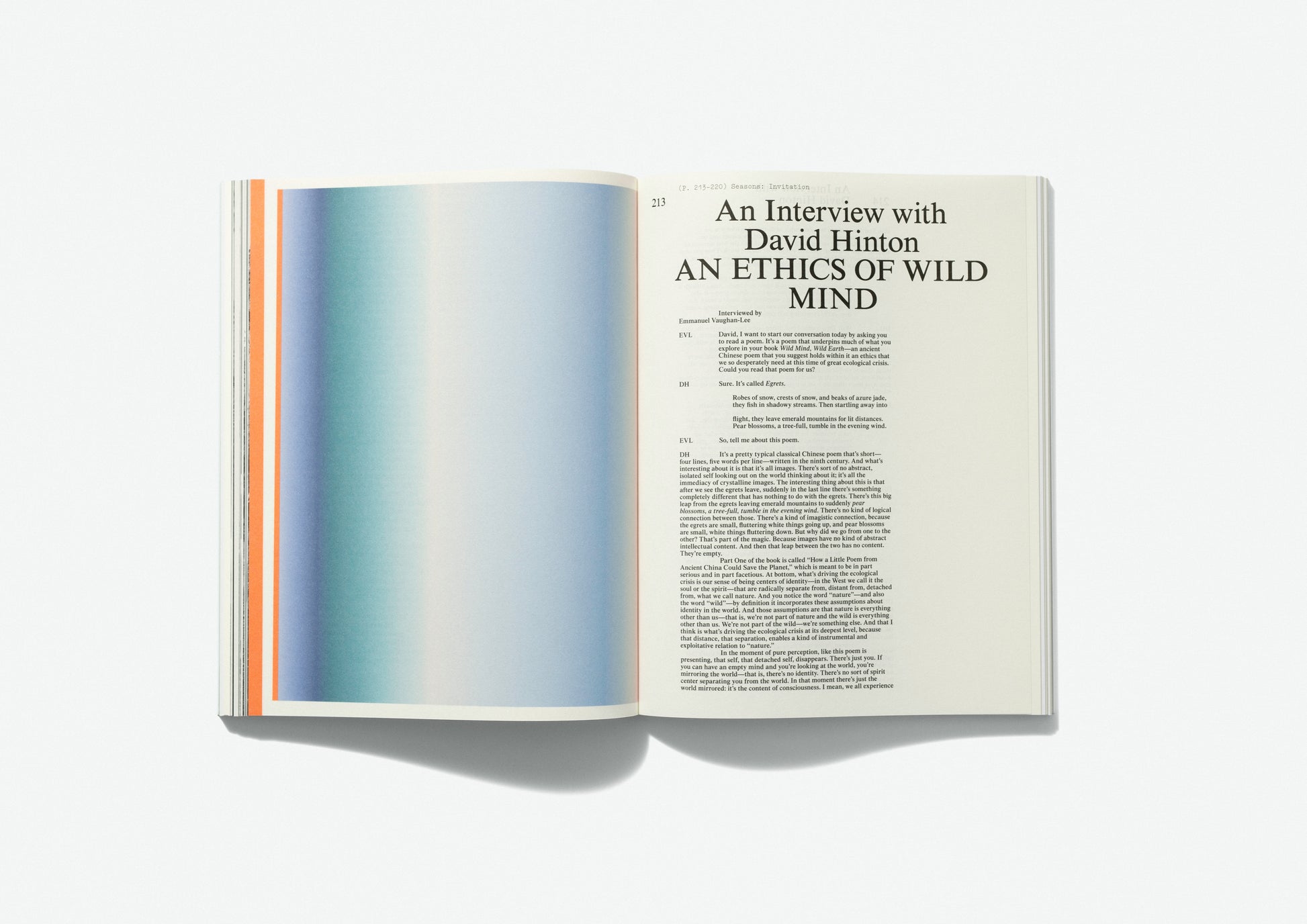 A collection of original haiku, essays, short fiction, photography, conversations, and poetry from Boris Acket; Melanie Challenger; David James Duncan; Camille T. Dungy; CMarie Fuhrman; Forrest Gander; Ben Goldfarb; Bear Guerra; David George Haskell; David Hinton; Jane Hirshfield; Brian Isett; Sandor Ellix Katz; Robin Wall Kimmerer; J. Drew Lanham; Sam Lee; Dara McAnulty; Lydia Millet; Marie Mutsuki Mockett; Ron Moss; Susan Murphy Roshi; Kerri ní Dochartaigh; Zoë Schlanger; Christina Seely; Jake Skeets; Studio Airport; Terry Tempest Williams; Kiliii Yüyan, this volume is infused with a spectrum of color and light; and listens for the turning song of the seasons—for what vanishes and what remains—attentive to these moments that call us into communion with the Earth.